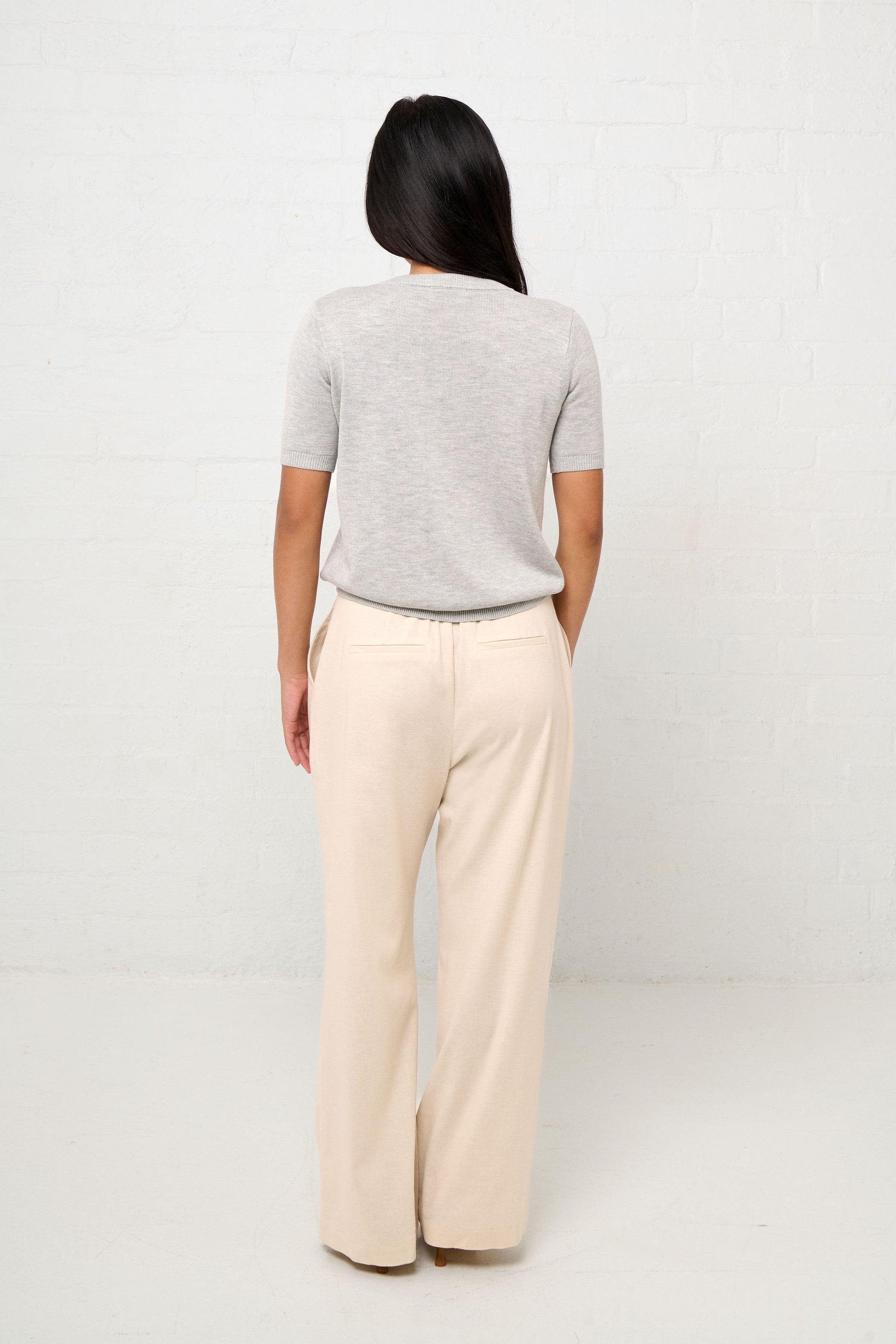 Tailored to flatter petite women, this knit tee features a clean V-neckline, short sleeves, and carefully balanced proportions that sit perfectly on shorter frames. The simple yet elevated cut ensures versatility, making it easy to dress up with tailored trousers or pair with denim for relaxed polish.